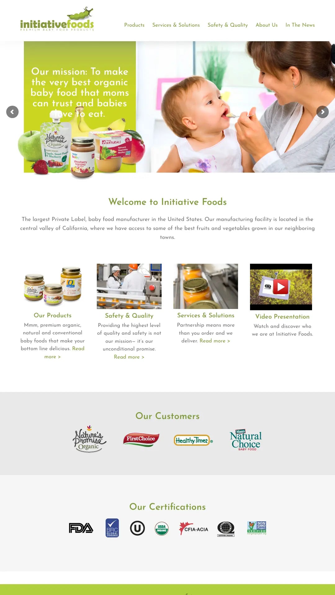 Initiative Foods is a leading U.S.-based private label baby food co-manufacturer located in Sanger, California. Established in 2002, the company has an estimated revenue range of $10 million to $50 million and employs between 51-250 people. They offer a wide variety of organic and conventional baby food products, including single foods, fruit and vegetable blends, and meat blends, available in pouches and plastic tubs. Their co-manufacturing services include contract manufacturing, private labeling, packaging development, and shipping logistics. Certifications include Quality Assurance International, OU Kosher, FDA, and Non-GMO Project.